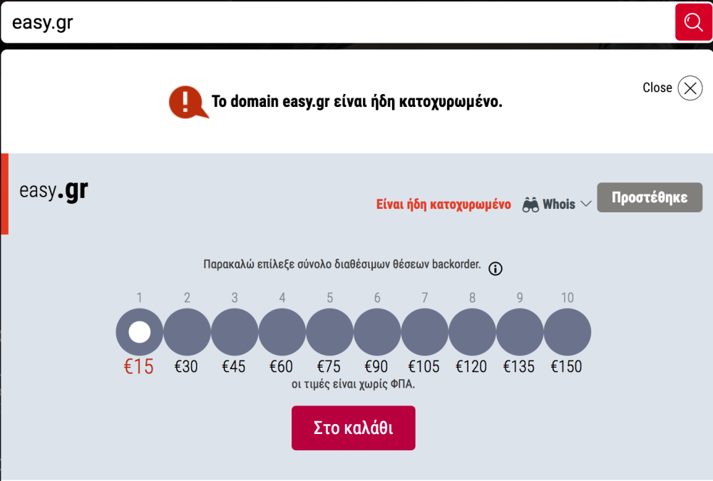 Με την υπηρεσία αυτή μπορείτε να κάνετε μία παραγγελία “backorder” για ένα Domain που έχει λήξει και το οποίο βρίσκεται στη διαδικασία “καραντίνας” για τις επόμενες 15 ημέρες. Με το πέρας της περιόδου χάριτος των 15 ημερών, το Domain απελευθερώνεται και είναι διαθέσιμο για την εκ νέου κατοχύρωσή του.