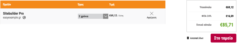 Στο καλάθι έχετε τη δυνατότητα να επεξεργαστείτε τη παραγγελία σας, αλλάζοντας το domain ή και τη διάρκεια του πακέτου που έχετε επιλέξει: