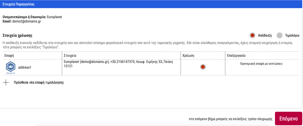 Πατώντας “Στο Ταμείο”, προχωράτε στο βήμα 2 για να δηλώσετε τα Στοιχεία Χρέωσης και τιμολόγησης.